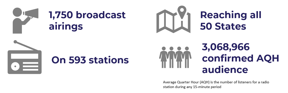 1,750 radio airings across 593 stations, reaching over 3 million listeners